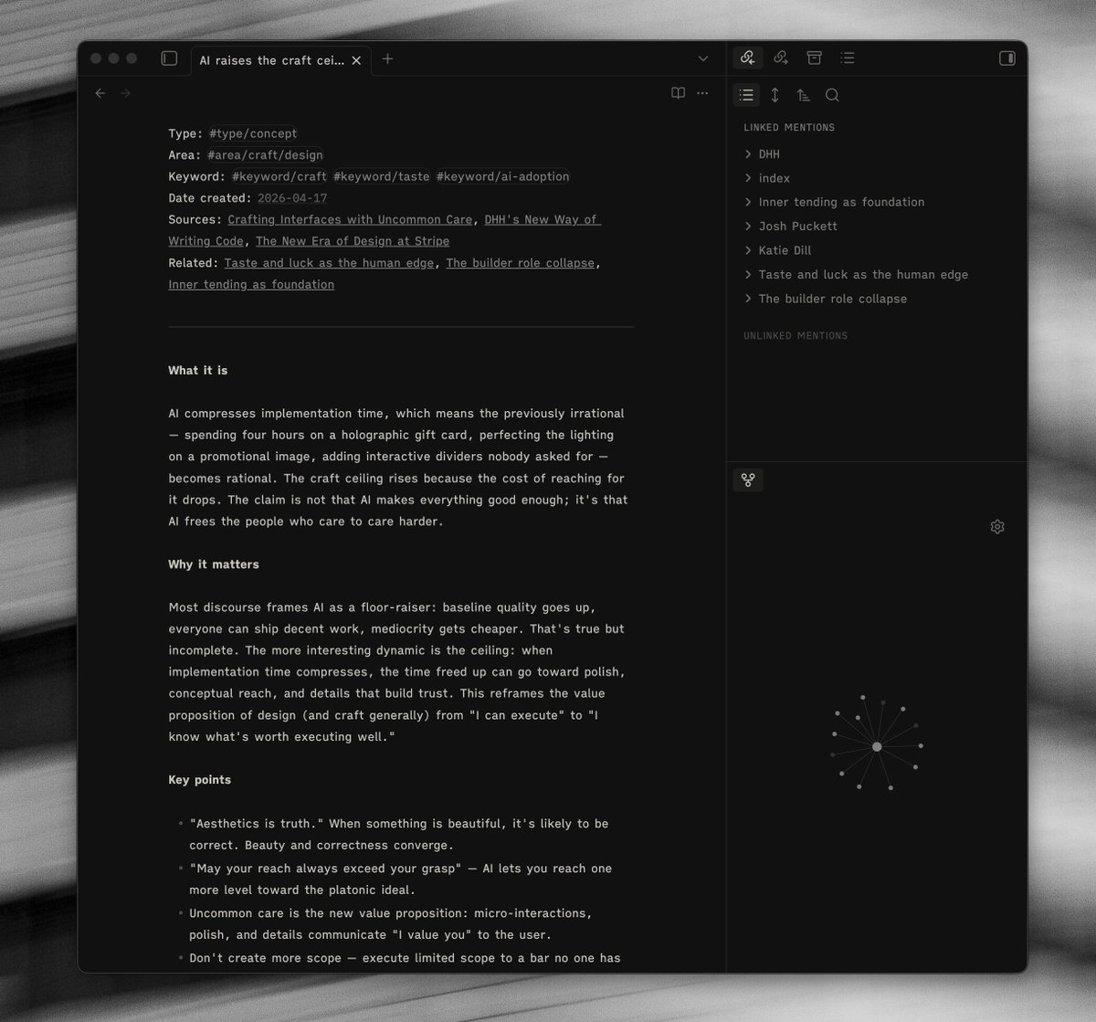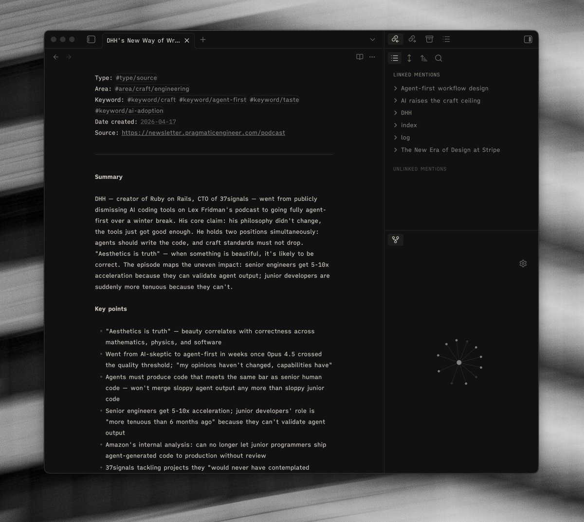Having this agent-only vault that can digest and articulate knowledge faster than me, and help support what I was getting from my initial note-taking practice is something that I am genuinely reaping the benefits from.