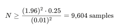 当 p=0.50 时,要在 95% 置信度下达到 ±0.01 的精度: