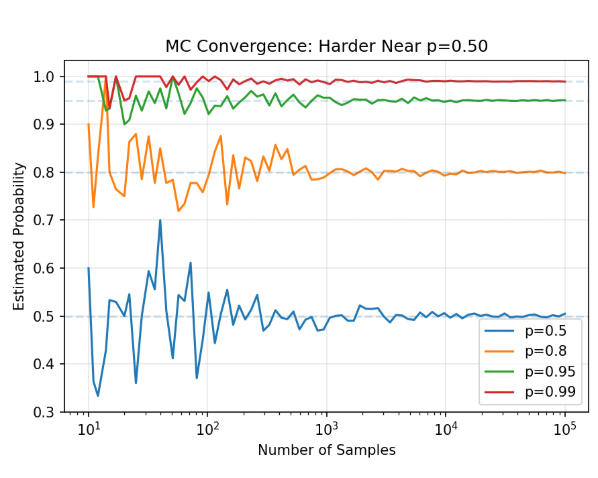 方差在 p=0.5 时达到最大。 平台上价格在 50 美分附近的合约,最不确定、交易也最活跃——也正是你的蒙特卡洛估计最不精确的地方。