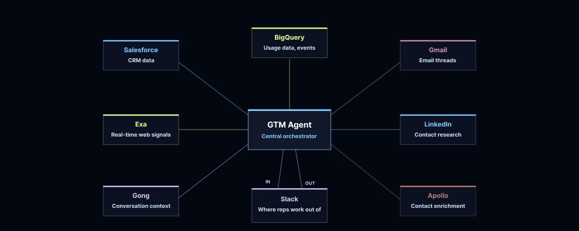 The GTM agent does two things: (1) it researches leads and writes personalized email drafts, and (2) it aggregates account-level signals across web activity, developer ecosystems, product usage, and marketing touchpoints to show reps where to focus. By tying that intent data back to a rep’s accounts, it surfaces meaningful activity, flags deal risks and competitive moves, and clarifies who is ideal to reach out to next.
