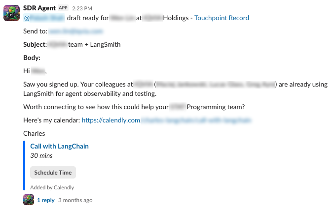 Every outbound at LangChain used to start the same way: a rep toggling between tabs. Salesforce for the account record, Gong for call history, LinkedIn for the contact, the company website for context. Fifteen minutes of research before a single word was written, and no easy way to know if a teammate had already reached out yesterday. Inbound follow-up used to mean manually dropping the same message into Apollo for every new contact.