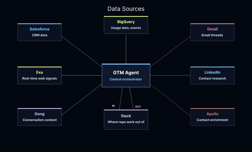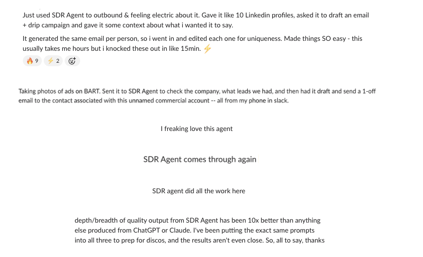 We later built a conversational Slack interface as a side experiment, mostly to give SDRs a way to interact with the agent directly. What we didn't expect was how quickly it spread to the rest of the company. Because the agent was already connected to Salesforce, Gong, BigQuery, and Gmail, people found uses we hadn't designed for. Engineers checked product usage without writing SQL. Customer success pulled support history before renewal calls. Account executives summarized Gong transcripts before meetings.