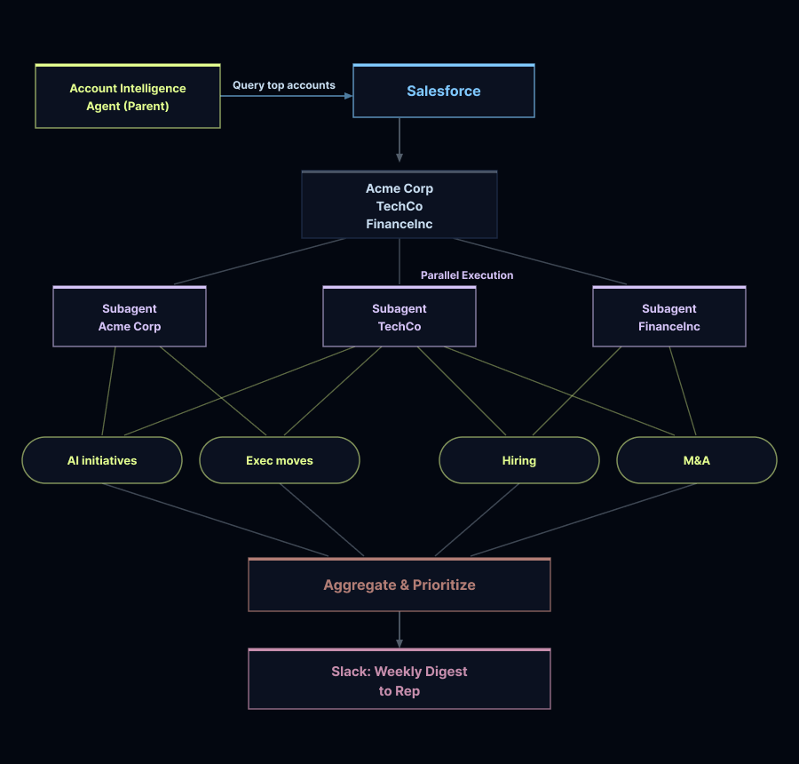 Account intelligence runs through compiled subagents: lightweight agents with constrained tool sets and structured output schemas that act as contracts with the main agent. The sales research subagent has access to Apollo, Exa, and BigQuery, and returns structured prospect and market context. The deployed engineer subagent uses Salesforce, Gong, and support tools to return usage trends, open tickets, and expansion signals.