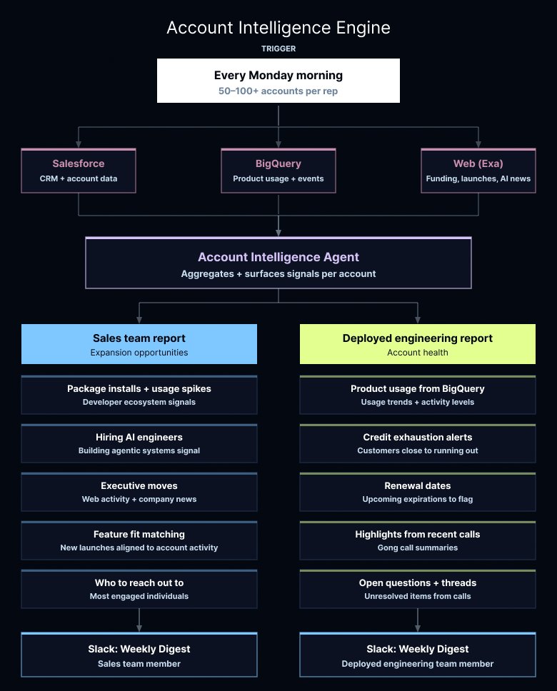 For sales, the agent aggregates signals across product usage, developer ecosystems, web activity, hiring trends, and company news to surface expansion opportunities. It flags executive moves, spikes in package installations, and whether a company is actively hiring AI engineers or building agentic systems – which is a strong signal they're ready to expand. It also identifies potential good fits when we launch new features, matching accounts whose recent activity aligns well with the new features. And because knowing an account is active isn't enough on its own, it surfaces which individuals are most engaged and suggests who to reach out to next.