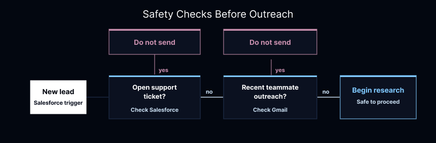When a new lead shows up in Salesforce, the agent takes over immediately. The first thing it does is look for reasons not to send anything. If someone just filed a support ticket, or if a teammate already reached out earlier in the week, sending an automated email would be a mistake. The agent is programmed to be cautious.