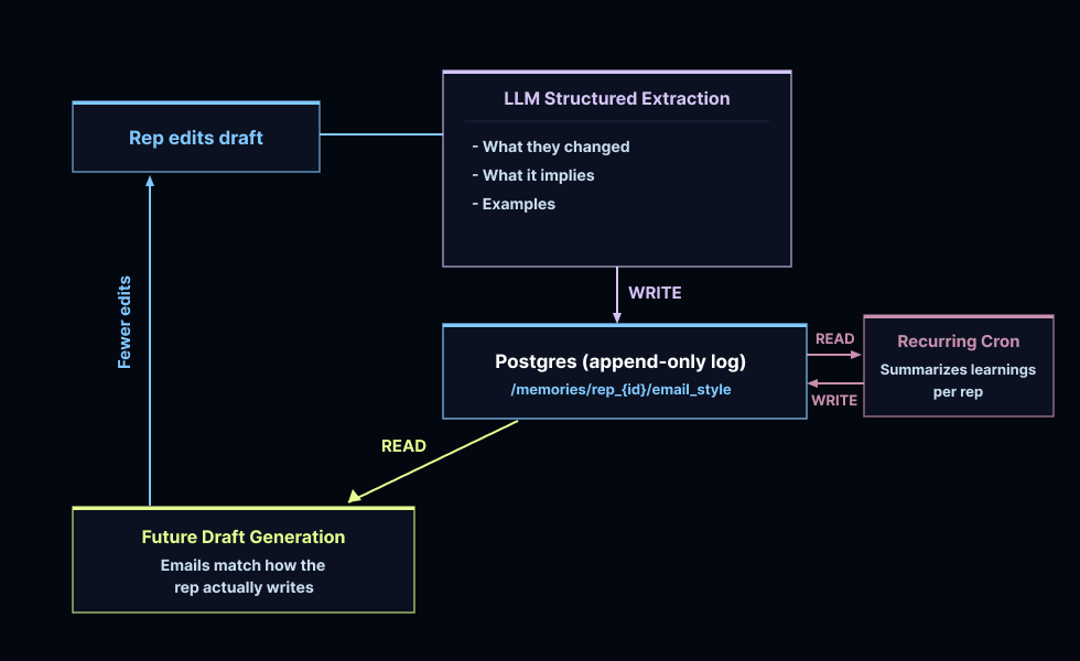 When a rep edits a draft in Slack, the system compares the original against the revised version. If the changes are substantive, an LLM analyzes the diff and extracts structured style observations: what changed, what it implies about the rep's preferences, and an optional quoted example. Those observations are stored in PostgreSQL, keyed per rep, and every future run reads them before drafting.