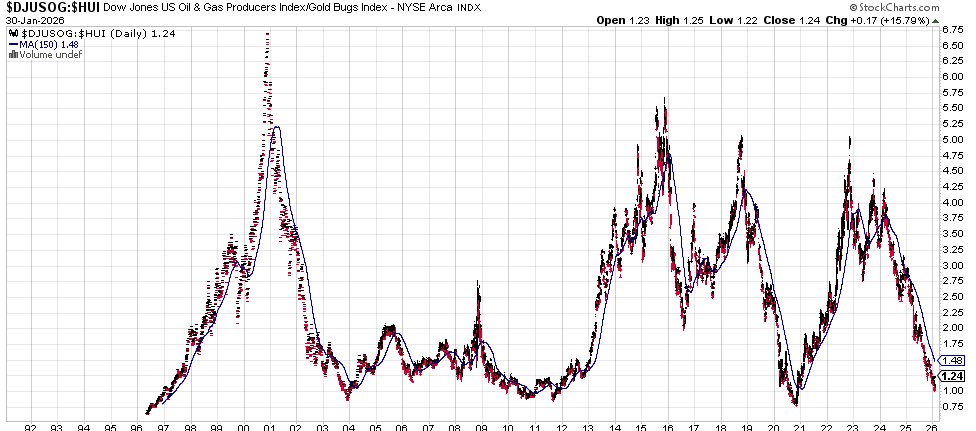 At current prices, I feel far more at ease buying oil companies than gold mines. The oil companies / gold mines ratio is at its HISTORICAL lows.