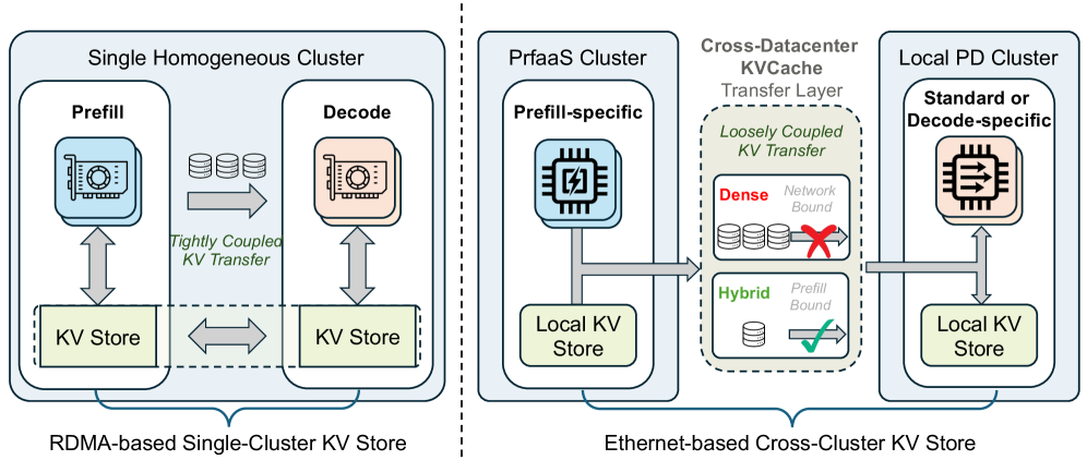 This observation leads to the key design principle of this paper: Prefill-as-a-Service (PrfaaS) via cross-datacenter KVCache. As illustrated in Figure 1, instead of forcing heterogeneous accelerators into a single RDMA island, PrfaaS constructs standalone clusters dedicated to long-context prefill using inexpensive, high-throughput compute. Besides, rather than fully separating every request, PrfaaS offloads only long uncached prefills to these compute-dense prefill clusters, while short requests remain on the local PD path. The resulting KVCache is then transferred over commodity Ethernet to decode-capable PD clusters. This design reflects the underlying systems reality: the motivation to split prefill is strong, but the reduced KVCache of hybrid models is still not cheap enough to justify indiscriminate transfer. What makes the design feasible is selective offloading, which concentrates cross-cluster transfer on the requests for which prefill acceleration matters most, while avoiding the inefficiency of sending short requests through a bandwidth-constrained path.