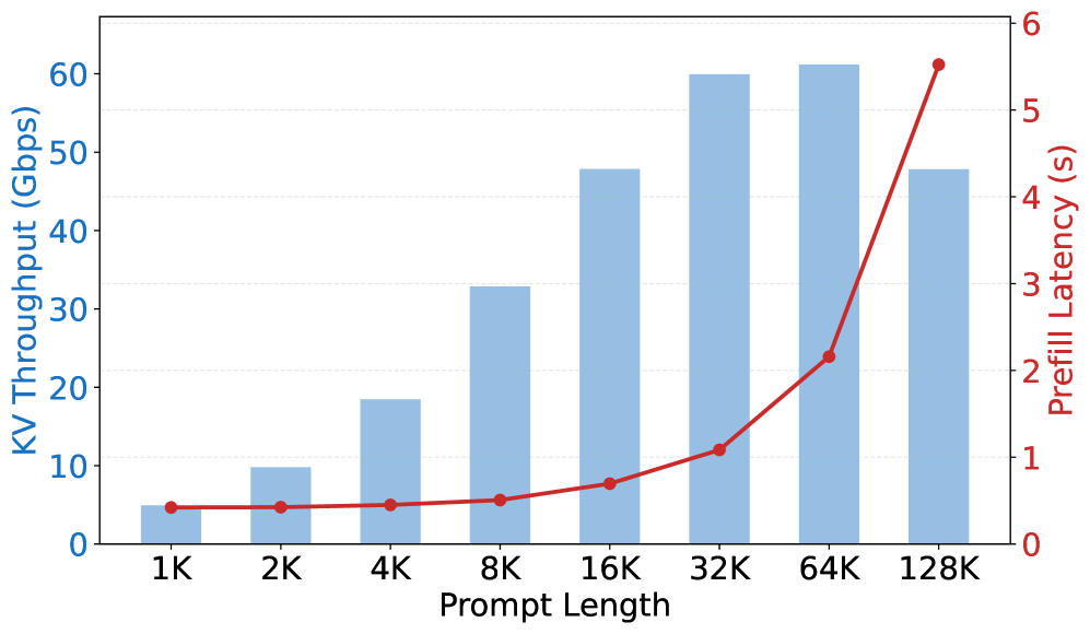 where Skv(l)S_{\text{kv}}(l) is the KVCache size for a request of length ll and Tprefill(l)T_{\text{prefill}}(l) is the corresponding prefill latency. The value of this metric depends largely on model architecture. Table 1 summarizes the configurations considered in this paper. For conventional dense-attention architectures, this transport demand is a dominant systems constraint. In standard Transformer-style attention, KVCache grows linearly with context length and can reach tens of gigabytes. Figure 2 shows the KV throughput of MiniMax-M2.5, a representative dense model with GQA, at various input lengths. The bottleneck is stark: for a 32K-token request, a single MiniMax-M2.5 instance produces KVCache at roughly 60 Gbps, requiring egress bandwidth that far exceeds the cross-datacenter Ethernet capacity of a typical machine. This is precisely why conventional PD disaggregation remains operationally tied to tightly integrated network domains. The network budget is so large that moving prefill and decode across looser interconnects, let alone across data centers, is simply not realistic.