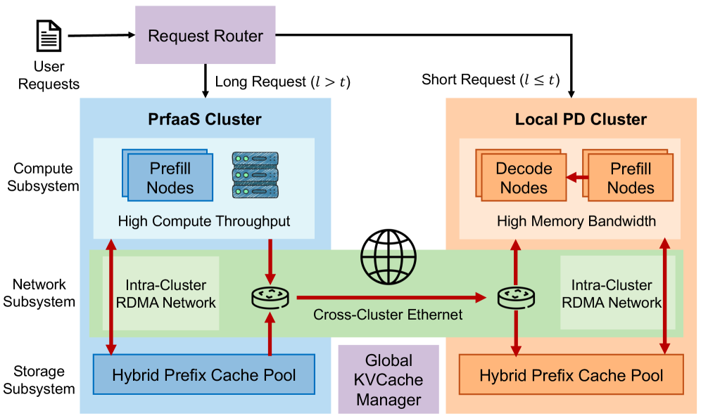 Each PrfaaS cluster functions as a stateless KVCache producer whose effective throughput equals the minimum of its prefill computation rate and its network egress bandwidth. Not all requests benefit equally from being offloaded to a PrfaaS cluster. Short-context prefill is typically memory- or communication-bound rather than compute-bound, resulting in low arithmetic utilization that cannot fully exploit the compute-dense accelerators in PrfaaS clusters. We therefore retain prefill nodes within the local PD cluster and apply a length-based routing policy. Let ll denote the incremental prefill length of a request (excluding any cached prefix) and tt a routing threshold. When ltlt, the request is routed to a PrfaaS cluster, and the resulting KVCache is transferred to a decode node upon completion. When l≤tl\leq t, the request is handled by a prefill node within the PD cluster. With the growing adoption of agentic workloads, the majority of requests are incremental prefills with prefix cache hits. For such requests, the global KVCache manager tracks the storage locations of all cached entries, ensuring that only the incremental portion is transferred across clusters. The scheduler must jointly consider cache affinity and cluster bandwidth when making routing decisions, as discussed in §3.4.3.