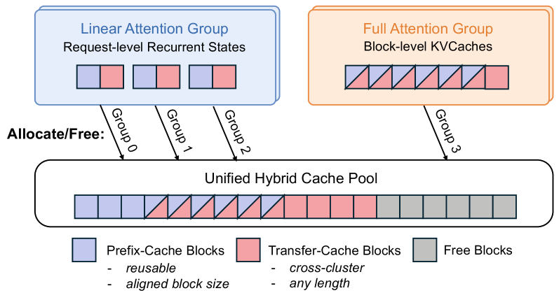 Based on vLLM’s hybrid KVCache manager [28], we build a hybrid prefix cache system tailored for cross-cluster KVCache transfer, as shown in Figure 4. Linear states and full-attention KVCache are managed by separate KVCache groups with aligned block sizes, allowing all groups to allocate and free blocks from a shared KVCache pool. On top of this shared pool, we partition cache blocks into two categories: prefix-cache blocks and transfer-cache blocks. Prefix-cache blocks must be fully populated before they can be reused across requests. Transfer-cache blocks hold the KVCache produced at the tail of a prefill request for PD-disaggregated transfer, and the cache pool discards them once the transfer completes.