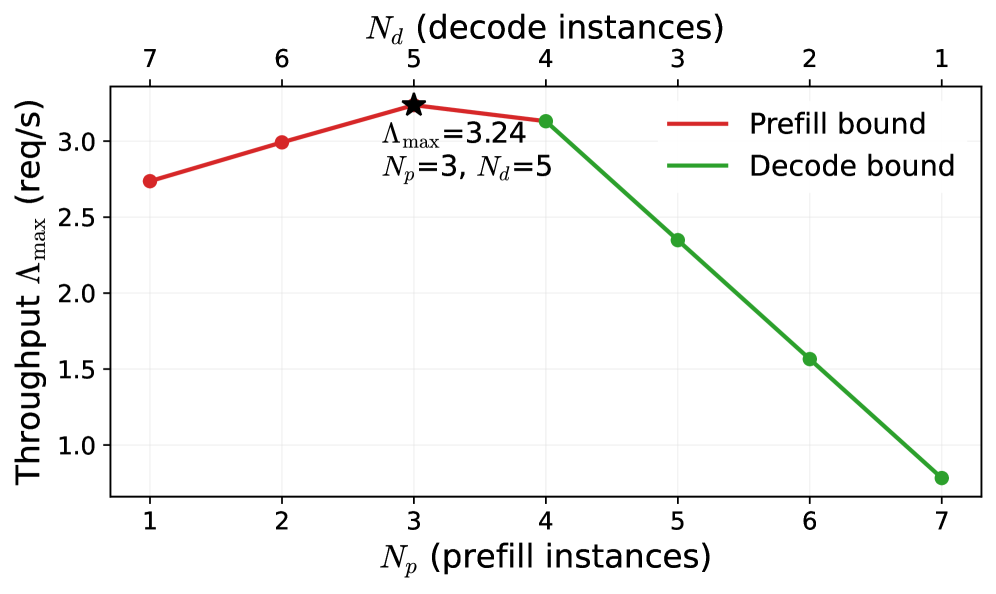 Λmax=min(Θprfaasp,Θpd-p1−p,Θpd-d).\Lambda_{\max}=\min\!\left(\frac{\Theta_{\text{prfaas}}}{p},\;\frac{\Theta_{\text{pd-p}}}{1-p},\;\Theta_{\text{pd-d}}\right). (6)