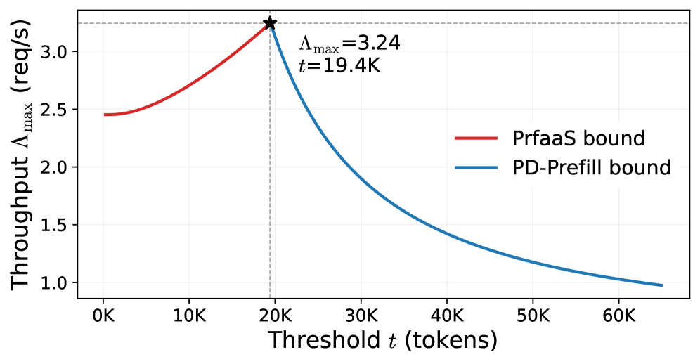 We model the steady-state throughput of the PrfaaS-PD system using the notation in Table 4. For tractability, we approximate all PrfaaS requests by a representative length llong=𝔼[L∣Lt]l_{\text{long}}=\mathbb{E}[L\mid Lt] with service time Tprefill(llong)T_{\text{prefill}}(l_{\text{long}}), and all PD-P requests by lshort=𝔼[L∣L≤t]l_{\text{short}}=\mathbb{E}[L\mid L\leq t] with service time Tprefill(lshort)T_{\text{prefill}}(l_{\text{short}}). Requests arrive uniformly at aggregate rate Λ\Lambda. A fraction p=P(Lt)p=P(Lt) of requests are routed to PrfaaS, and the remaining 1−p1-p are handled by PD-P.