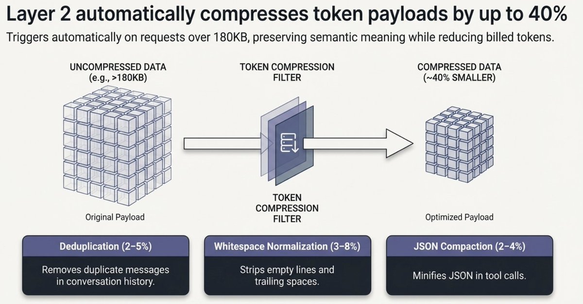 这三层机制都默认开启,并且完全安全——不会改变语义含义。压缩会在请求大于 180KB 时自动触发(在智能体工作流和长对话里非常常见)。