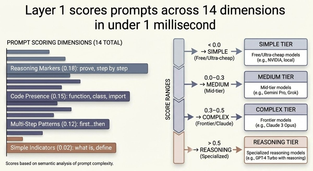 ClawRouter 会在 <1ms 内从 14 个维度为每条提示词打分,并把它路由到能胜任任务的最便宜模型。