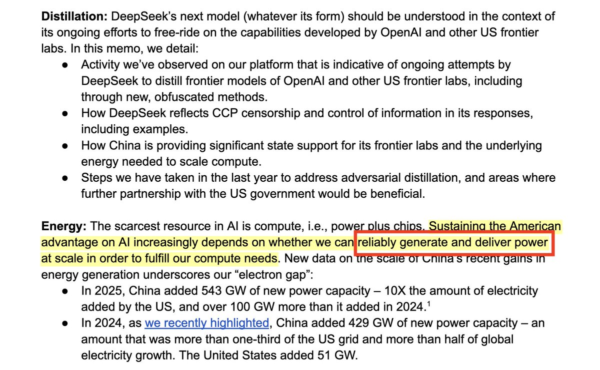 OpenAI warning Congress that in 2024, China added 429 Gigawatts (GW) of new power capacity, which was more than a third of the entire US grid and more than half of global electricity growth. Without a radical expansion of the American power grid, they believe China’s "brute force" energy buildout will eventually allow them to surpass Western AI capabilities.
