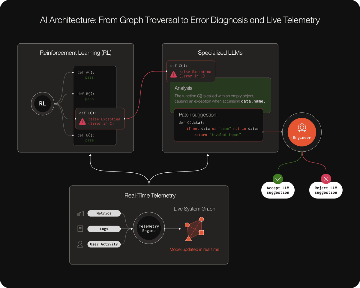 the architectural insight is subtle but important. most systems try to prescribe a schema upfront. define your entities, define your relationships, then populate. PlayerZero inverts this. their CEO Animesh Koratana calls it the "two clocks" problem: organisations have spent decades building infrastructure for state (what exists now) but almost nothing for reasoning (how decisions were made over time). PlayerZero captures both.