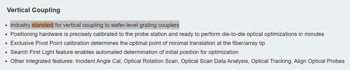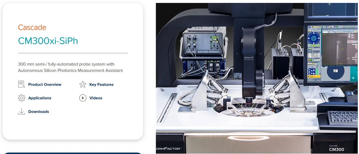 FormFactor is the industry standard for SiPh wafer probing. Its distributor PSI Solutions lists the CM300xi-SiPh as the “Industry standard for vertical coupling to wafer-level grating couplers,”[5] and the system is currently in use at over 100 leading SiPh device manufacturers worldwide.[6]