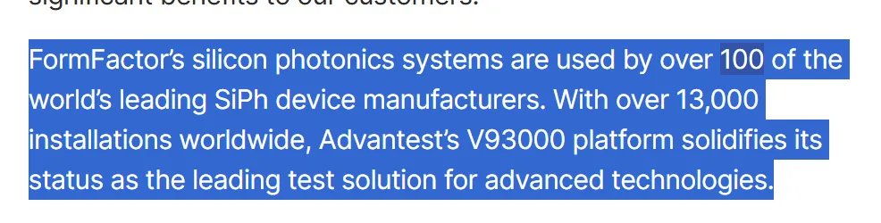 [6] FormFactor and Advantest Partner on SiPh Wafer-Level Test Cell: Announced November 2024. Confirms FormFactor SiPh systems are in use at over 100 leading SiPh manufacturers worldwide.