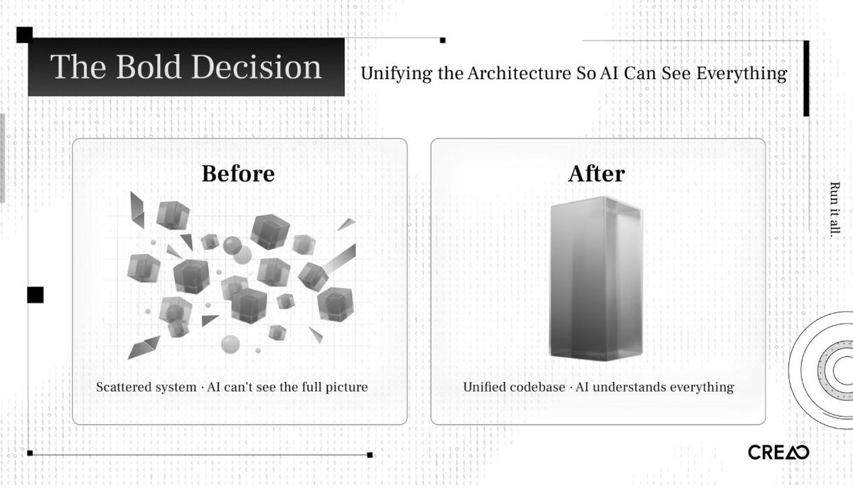 Our old architecture was scattered across multiple independent systems. A single change might require touching three or four repositories. From a human engineer's perspective, it is manageable. From an AI agent's perspective, opaque. The agent can't see the full picture. It can't reason about cross-service implications. It can't run integration tests locally.