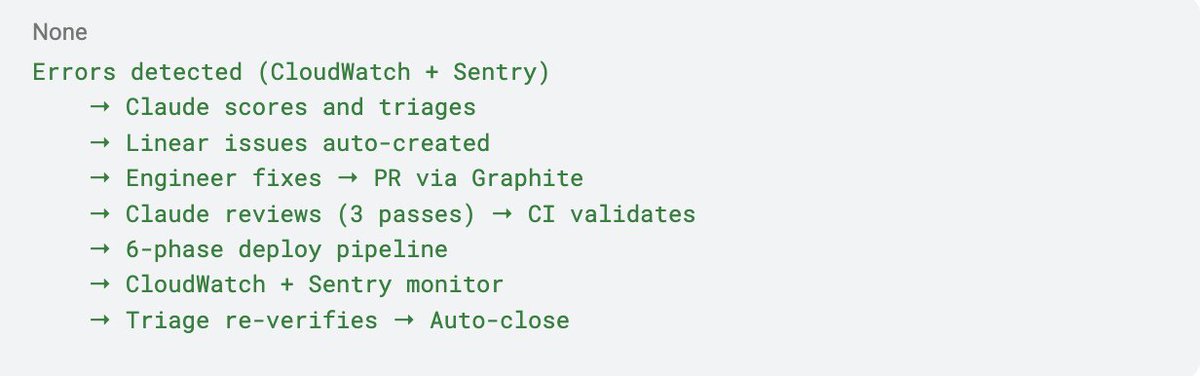 When an engineer pushes a fix, the same pipeline handles it. Three Claude review passes evaluate the PR. CI validates. The six-phase deploy pipeline promotes through dev and prod with testing at each stage. After deployment, the triage engine re-checks CloudWatch. If the original errors are resolved, the Linear ticket auto-closes.