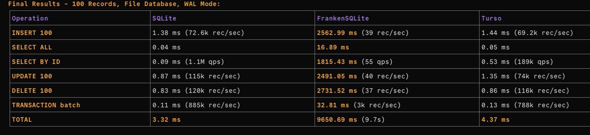 EDIT: Several readers have confused this project with Turso/libsql. They are unrelated. Turso forks the original C SQLite codebase; the project analyzed here is a ground-up LLM-generated rewrite by a single developer. Running the same benchmark against Turso shows performance within 1.2x of SQLite consistent with a mature fork, not a reimplementation.