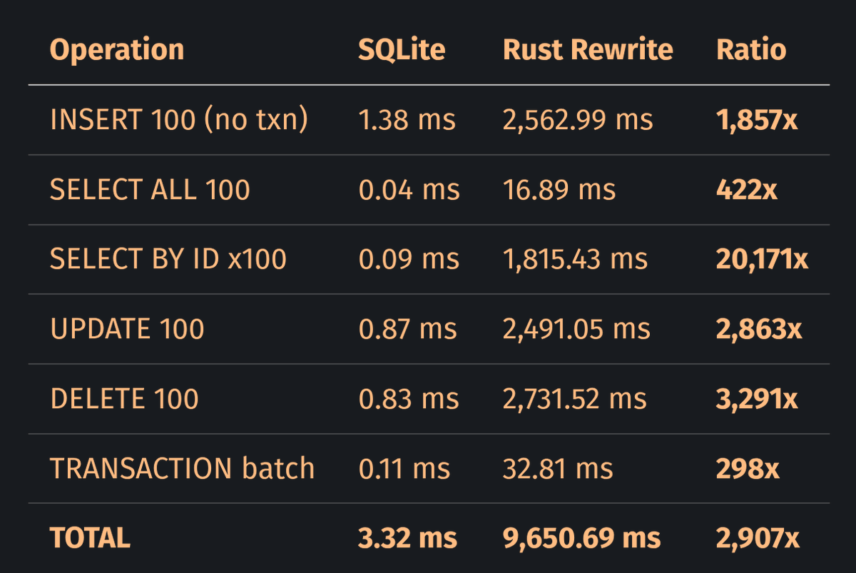 Every decision sounds like choosing safety. But the end result is about 2,900x slower in this benchmark. A database's hot path is the one place where you probably shouldn't choose safety over performance. SQLite is not primarily fast because it is written in C. Well.. that too, but it is fast because 26 years of profiling have identified which tradeoffs matter.