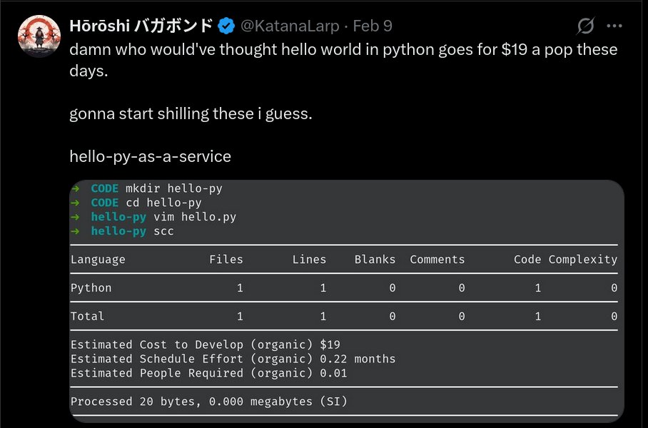 The tools used to measure LLM output reinforce the illusion. scc's COCOMO model estimates the rewrite at $21.4 million in development cost. The same model values print("hello world") at $19.