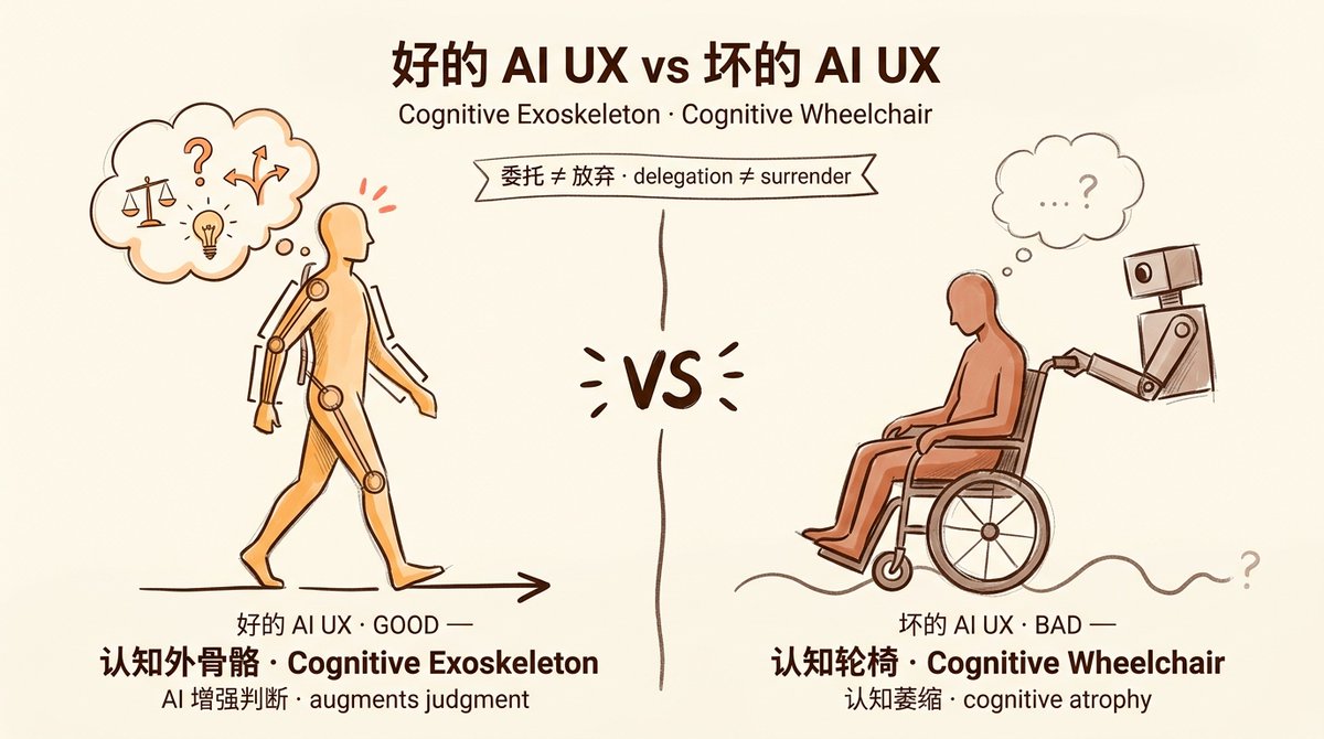 好的 AI UX = 认知外骨骼(Cognitive Exoskeleton) 坏的 AI UX = 认知轮椅(Cognitive Wheelchair)