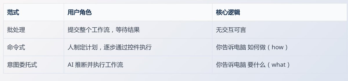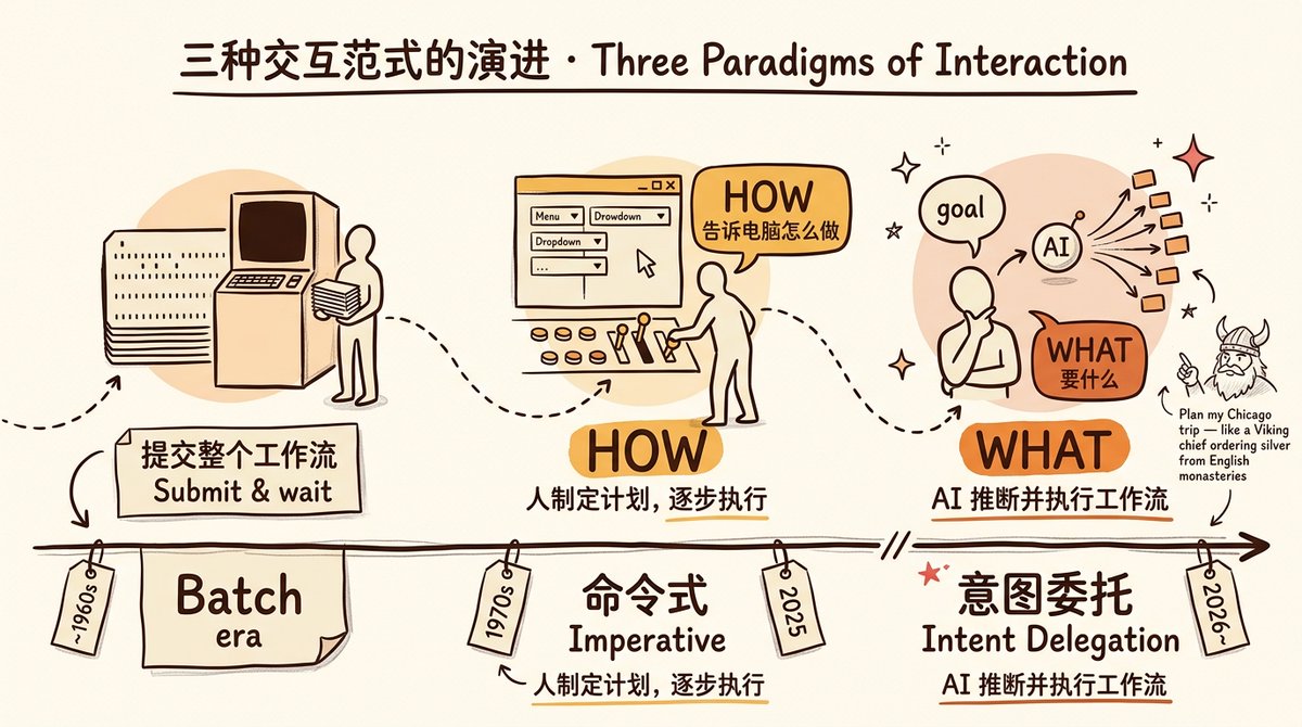 AI 作为界面,其最重要之处不在于用自然语言聊天,而在于它改变了用户的角色。AI 将计算从"命令式交互"转变为"意图委托式结果规范":用户陈述要达成的结果,系统自行决定执行步骤。