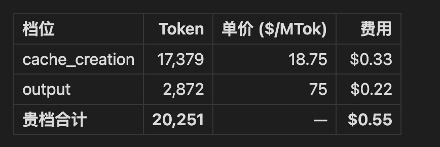 真正决定账单的是 token input + cache_creation(往缓存写新内容)和 output(生成)。便宜档(cache_read + input)单价不到它们的 1/10,这里忽略,只算贵档: