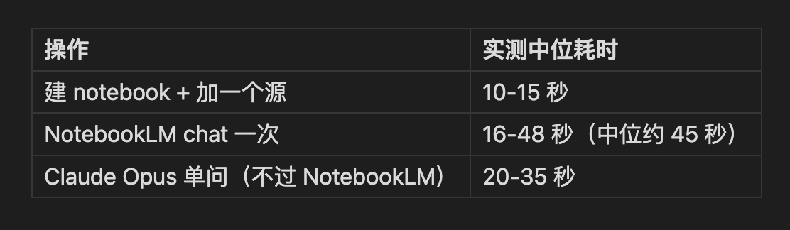 操作 实测中位耗时 建 notebook + 加一个源 10-15 秒 NotebookLM chat 一次 16-48 秒(中位约 45 秒) Claude Opus 单问(不过 NotebookLM) 20-35 秒
