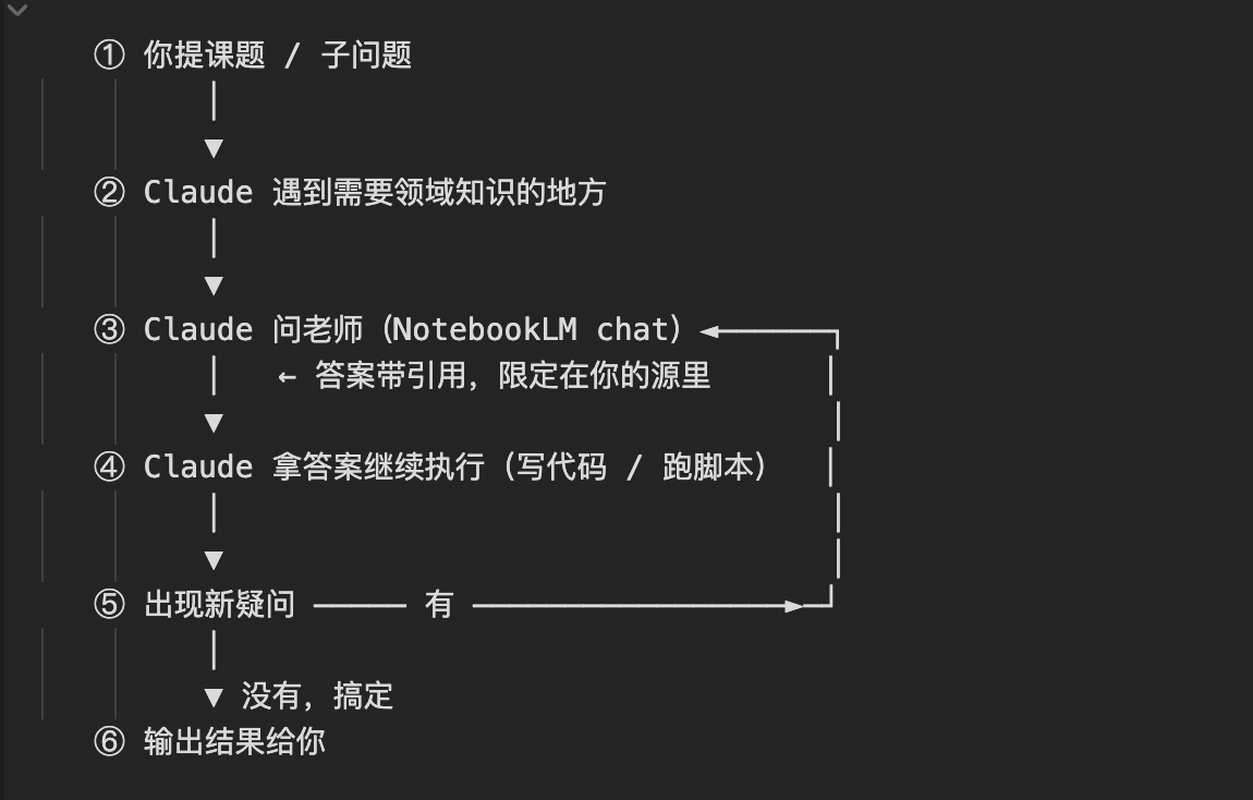 把 NotebookLM 变成 Claude 的一个工具。一件事就够了——Claude 需要领域知识时,自己去问老师。