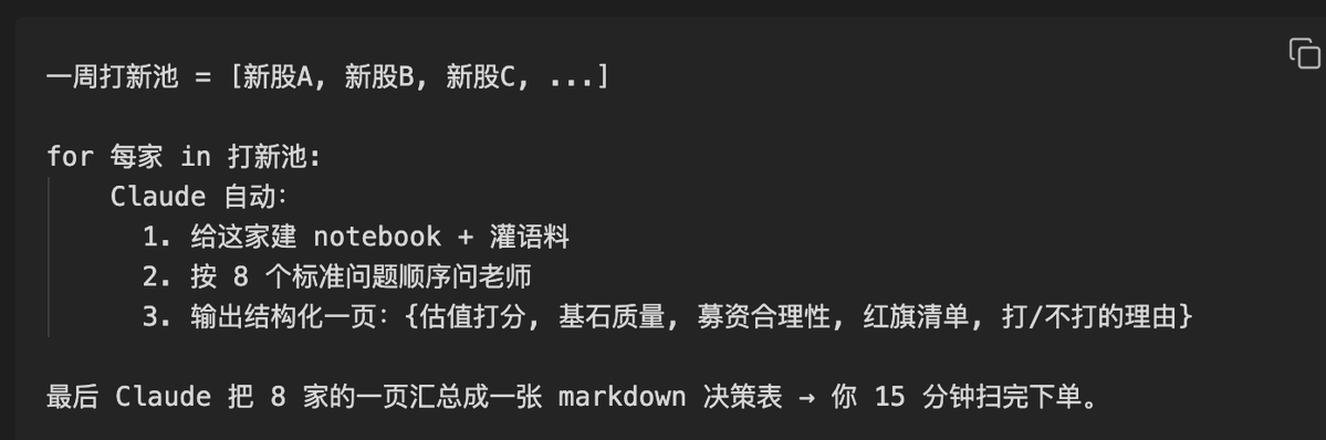 一周打新池 5-8 家 = 40-64 次查询,全程论文(这里是招股书)不进 Claude 对话——单本招股书 150-250k token,5 家就是 100 万 token 的语料量,传统做法光这一项一周就能烧掉 $50+。走本文做法 $2 以内。